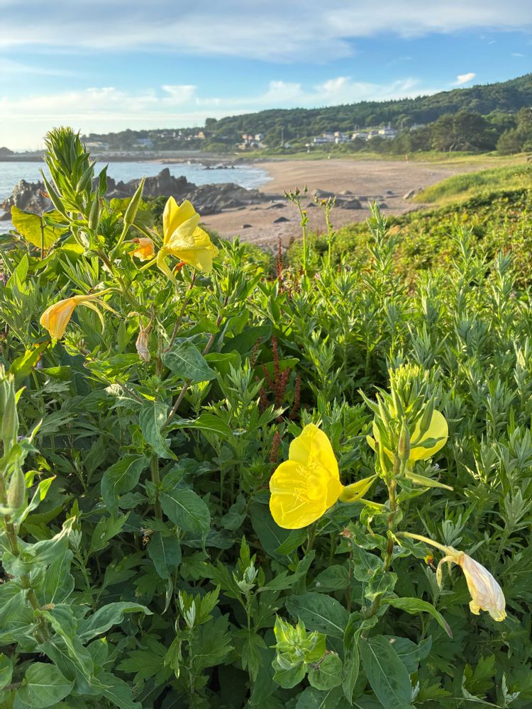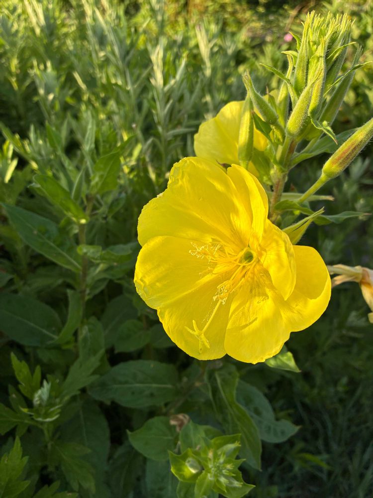 朝日に透けるオオマツヨイグサ。日の出を楽しんでお散歩、やっとちゃんと咲いてる姿に出会えました。いつも半分萎れてたから、早起き散歩した甲斐がありました!