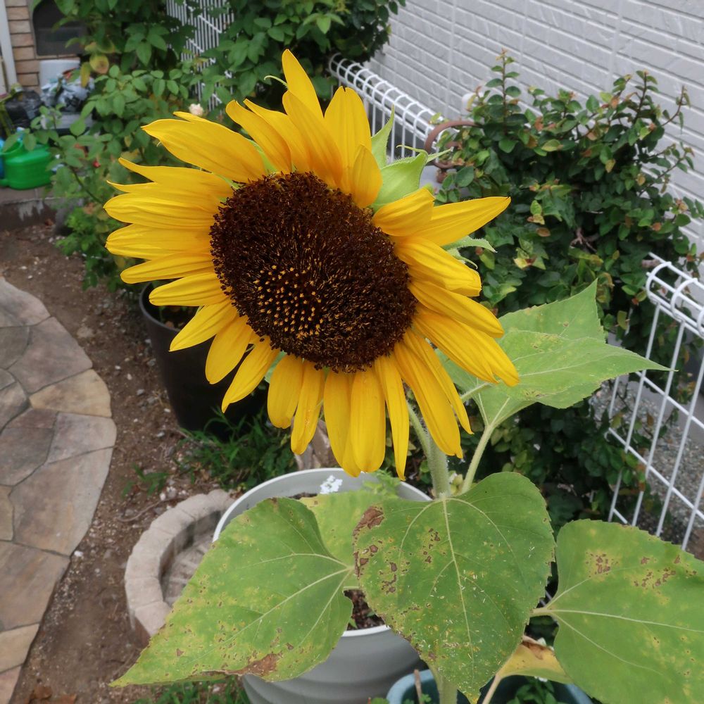 ③ ひまわり 先を想像せずに苗から育成 1.5 m 位 花が垂れ下がり気味です 15 cm の鉢では無理があったようです 来年は矮性のもので・・