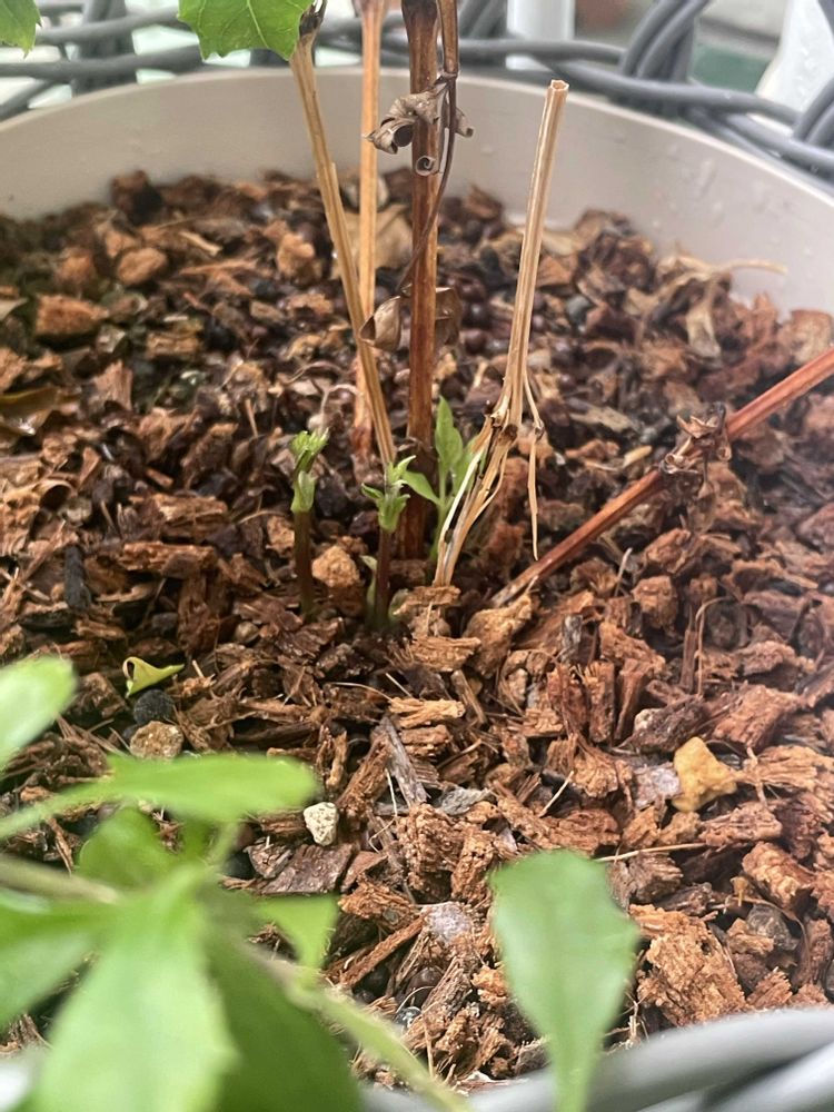 クレマチス響、地上部が枯れて暑さでダメだったかぁ…と半ば諦めていたら、芽が出てきました🌱✨