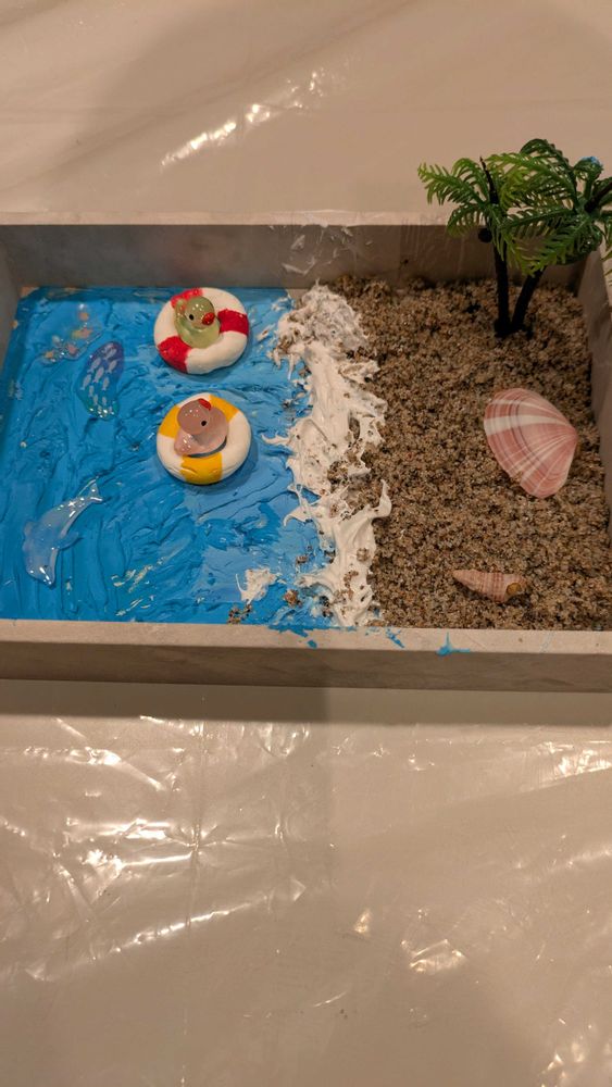 素敵な作品に仕上がりました🙋2つの浮き輪の中にアヒルを入れてました😍