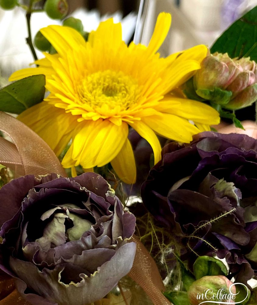 黄色いガーベラさんとシックな色のトルコキキョウさん