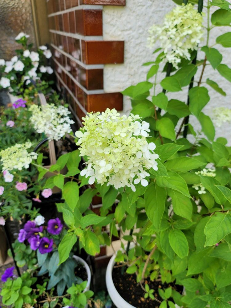 ❁❀ピラミッドアジサイ❀も爽やかなライムグリーンに咲きだしてきました💚🤍🌿