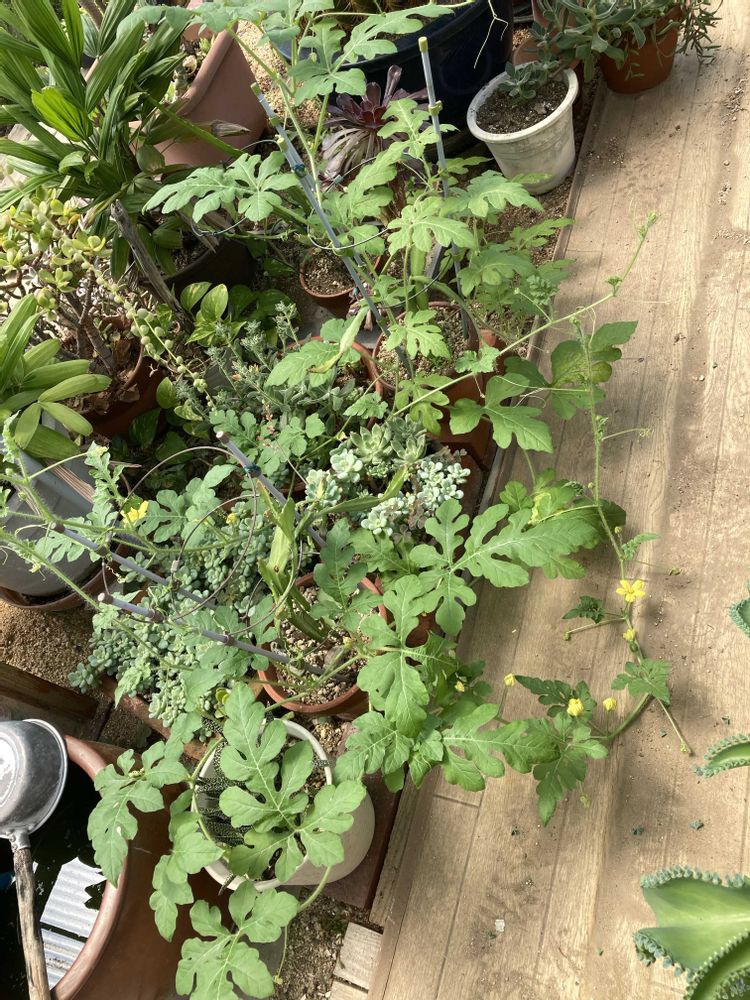 多肉植物から芽を出したスイカさんもしかして、スイカになるの?このままじゃ多肉が危ない?