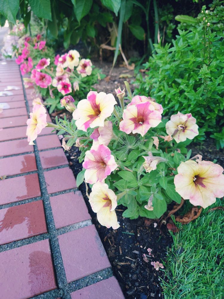 花壇の縁沿いに並べて植えたペチュニア。品種改良品だったおかげか、見切り品のワリには暑さにも負けず元気に咲いてくれてます☺️