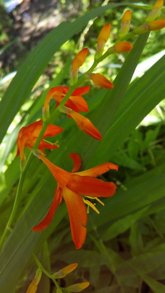 野生化したと思われるヒメヒオウギズイセン(モントブレチア、クロコスミア)が林縁の散策路に 小さな朱赤色の花を可愛らしく咲かせていました 一般のスイセンのヒガンバナ科ではなくアヤメ科に属しているそうです 黄色い蕊が光輝き 花言葉どおりの気品に満ちた花姿でした