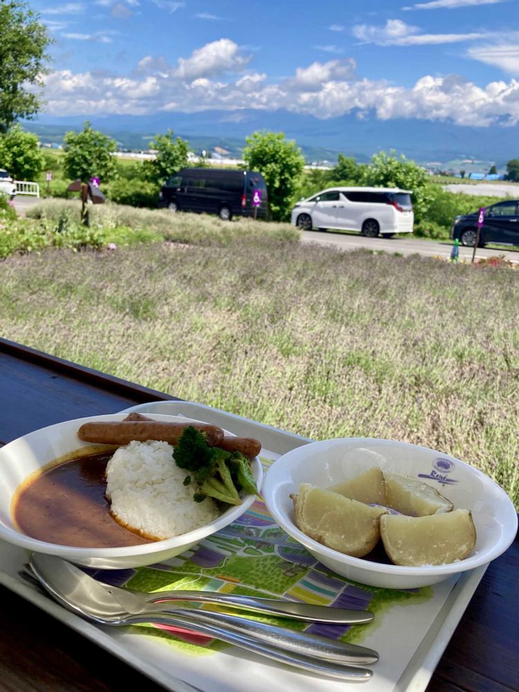 いい香りのラベンダー畑を目の前にカレーやジャガイモ