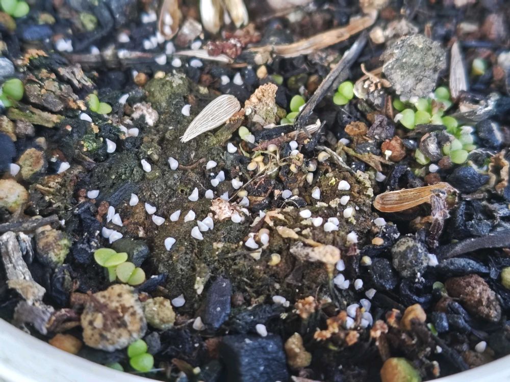 次々できる桜吹雪の種をそこらじゅうの鉢に播く
