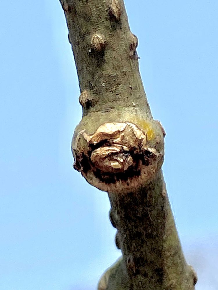 葉痕に隠れてよく見えないけれど、ぽっこりとふくらんでいます