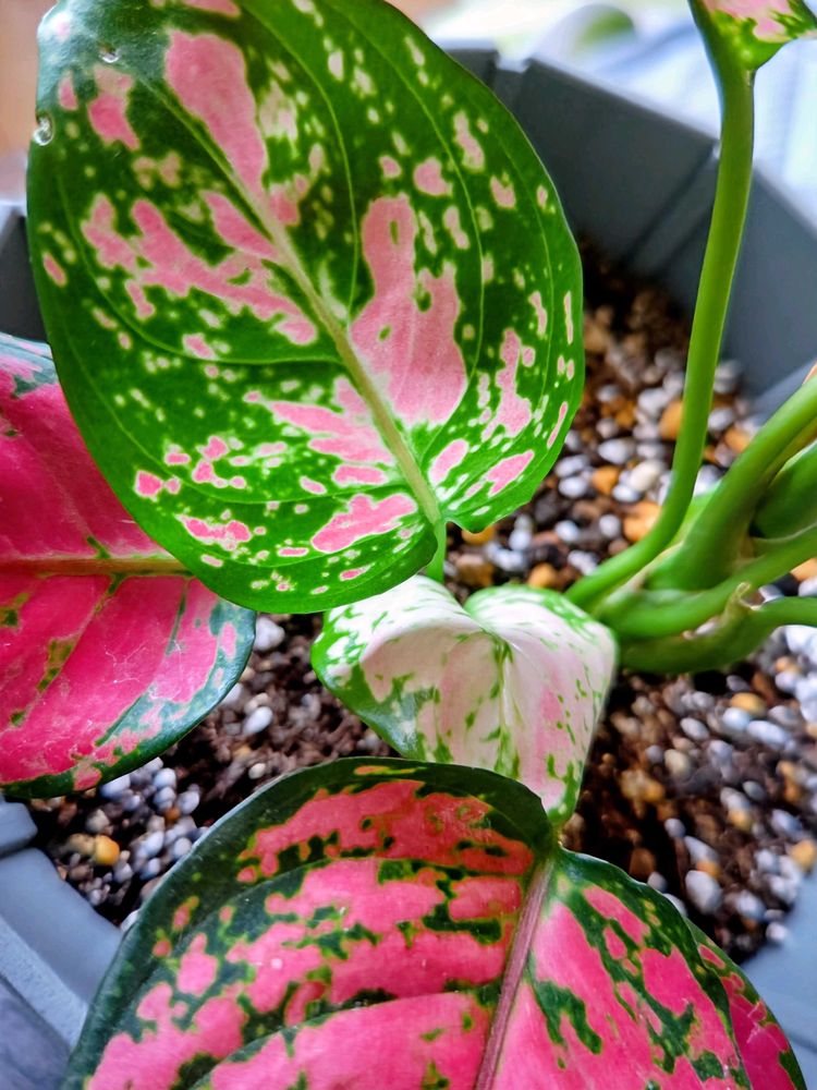 開いた新芽は緑の斑入り🙌🙌🙌根詰まりが原因で、赤い葉っぱばかりになってたようだ。植え替えて良かった〜😆。