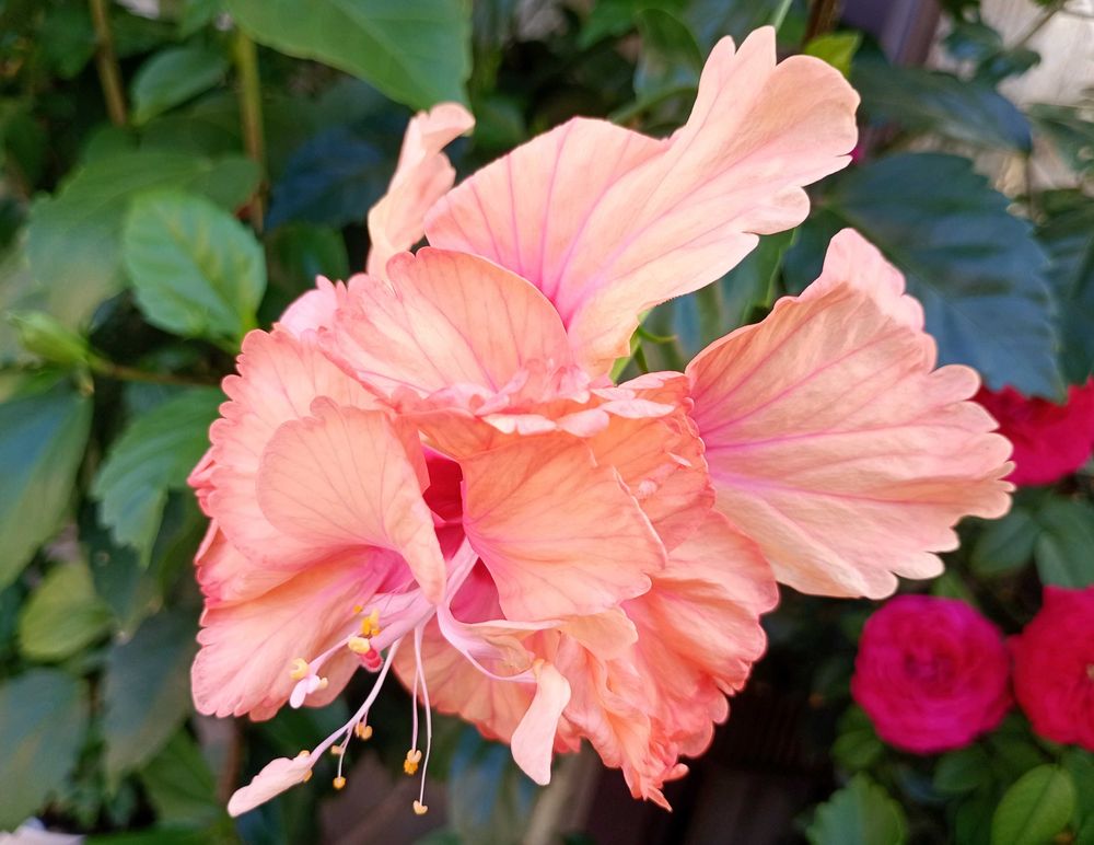 ハイビスカスのフラミンゴ🦩もシベが際立って、花先はくしゅくしゅ ふっくら。