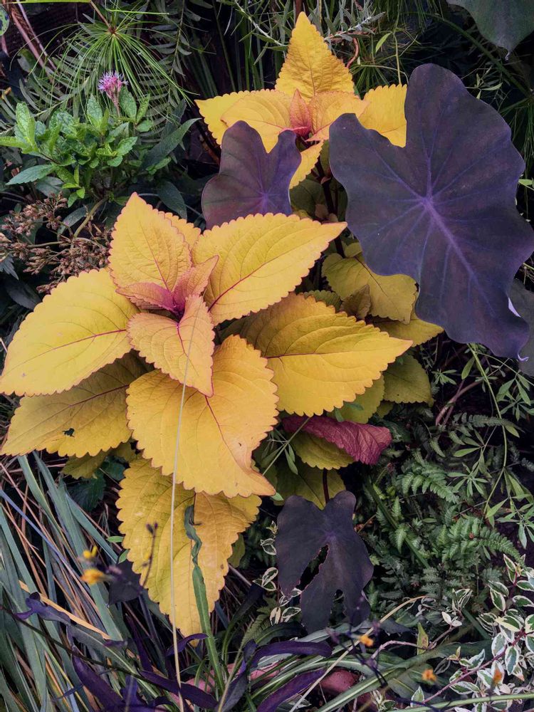コロカシアがランナーを伸ばして離れた場所のコリウスとコラボしてました🤗いい感じですね