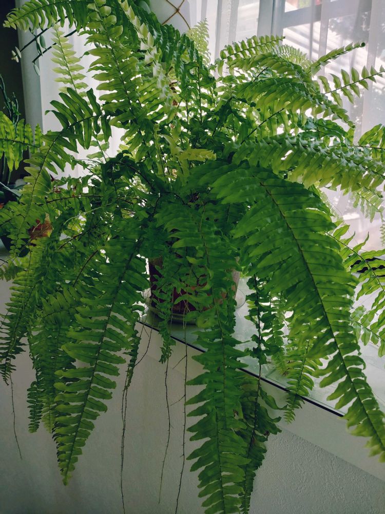 ほとんどのグリーンを屋外へ出してしまい寂しくなっていたリビング窓辺一等地に、お気に入りのシダを持ってきました🪴隙間埋めのつもりが主役級の存在感🤣