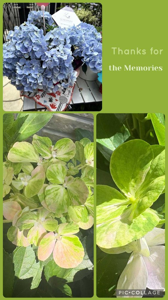 『5月にもらった青紫の満開の姿(最後の画像)と、8月の現在咲いている**グリーン〜ピンク系の花には明らかな違いがありますね。この変化は、品種の特性と剪定・生育条件によるものです。