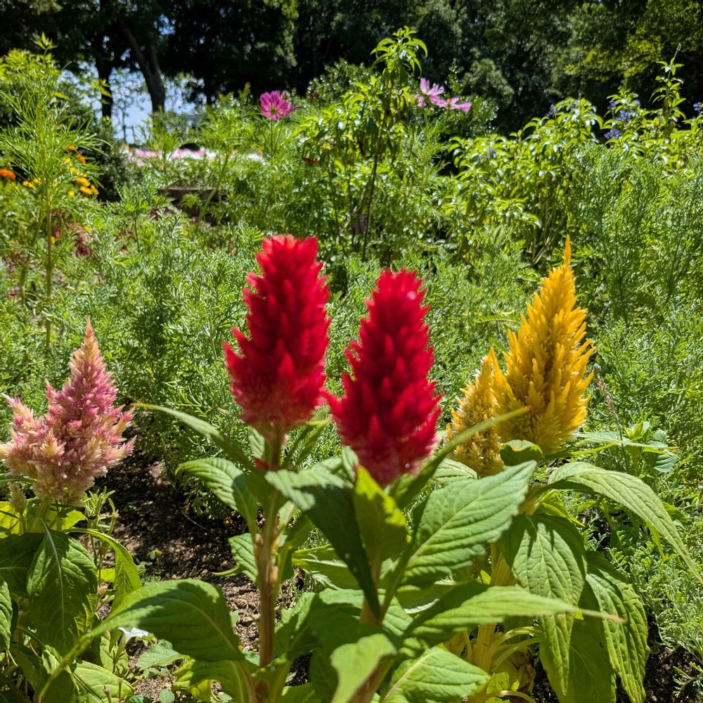ケイトウ、千日紅、ルドベキアと、さくらちゃんです😄暑くても、夏休みの、元気な子供たちを見ると、癒されますね😄