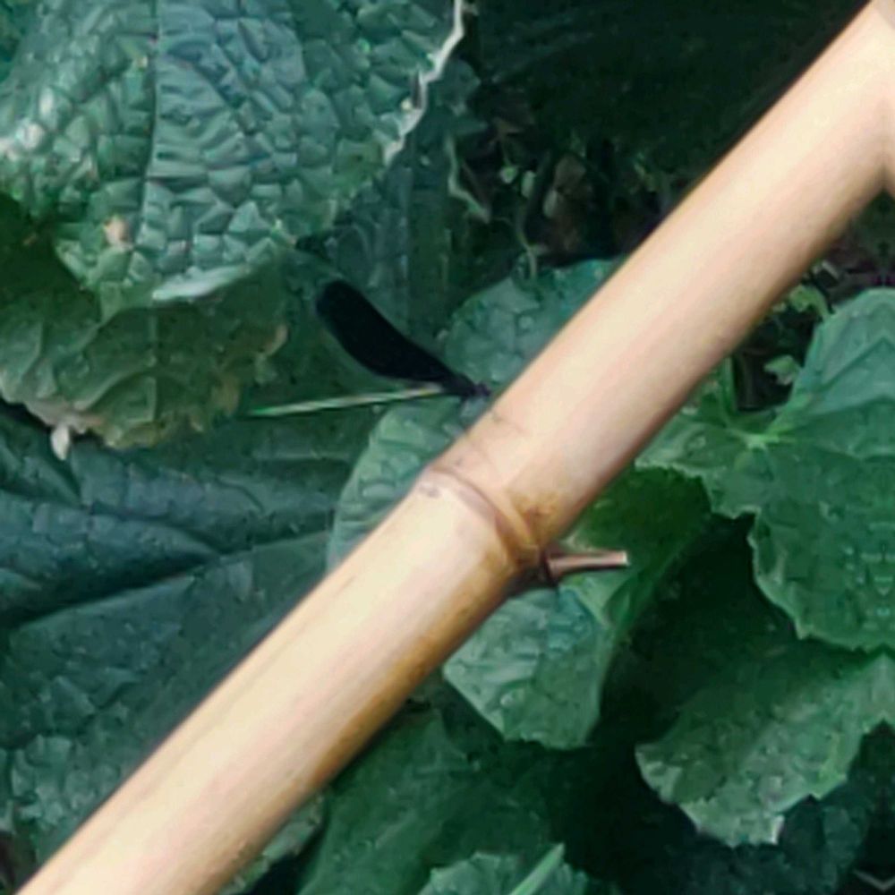 〈地道投稿〉きゅうり棚に風対策補強竹に「ハグロトンボ」今年初飛来です。朝7時50分町から熊🧸さん情報入りました(スマホで確認したのは、10時頃銀行で見る😬俺の集落 先週は川渡熊)。夕方水やり中隣人から、隣の空き家の間に🧸いた(小熊出た🧸)との事です🥴実は30分前自転車でゴミ出しました。