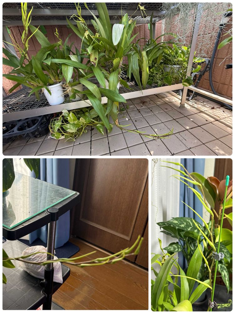 切花予定です 横のままだと花芽の向きが宜しくないので、花が咲く前に縦に矯正中😊