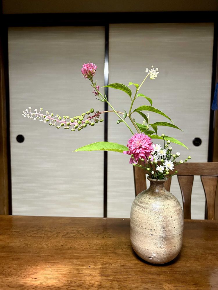 4、他の部屋の片隅に生けたもの。ヨウシュヤマゴボウはリサイクルしています。ヨウシュヤマゴボウの自然でリズムのある形が大好きです