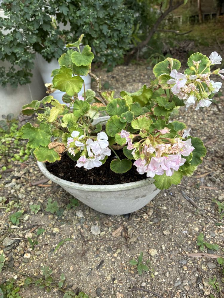 ④こちらはハンギングだったゼラニウムが元気無くなってきたので、鉢植えに戻しました。