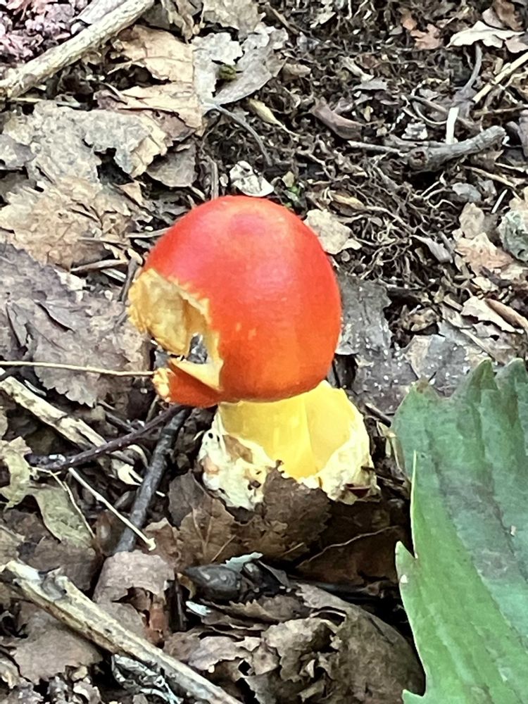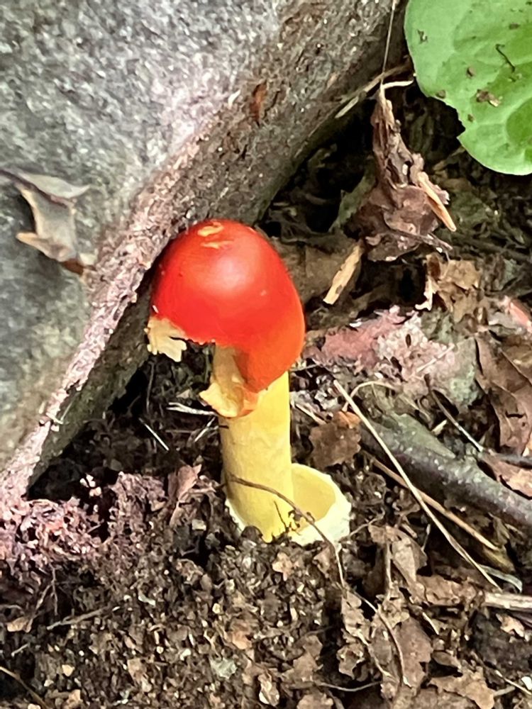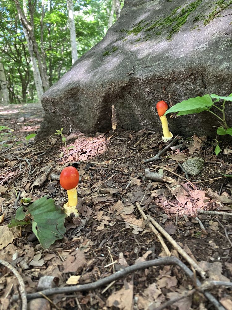 タマゴタケ 愛らしい姿の食べられるキノコ 3年前に見たけど見つからない🥲でも石の裏にあるのではないか😍よく見ると食べられている