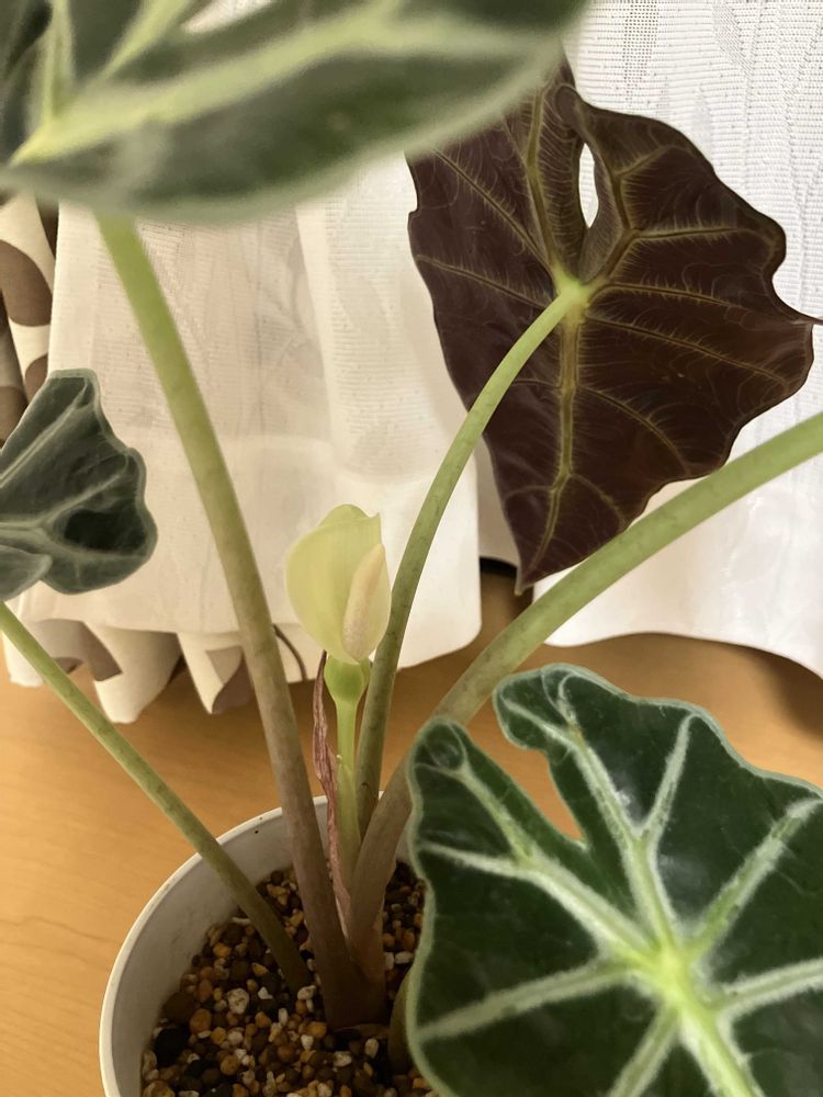 1、2二枚目はネットで購入した可愛らしいサイズのフィロデンドロン。3枚目はアロカシア アマゾニカの花。
