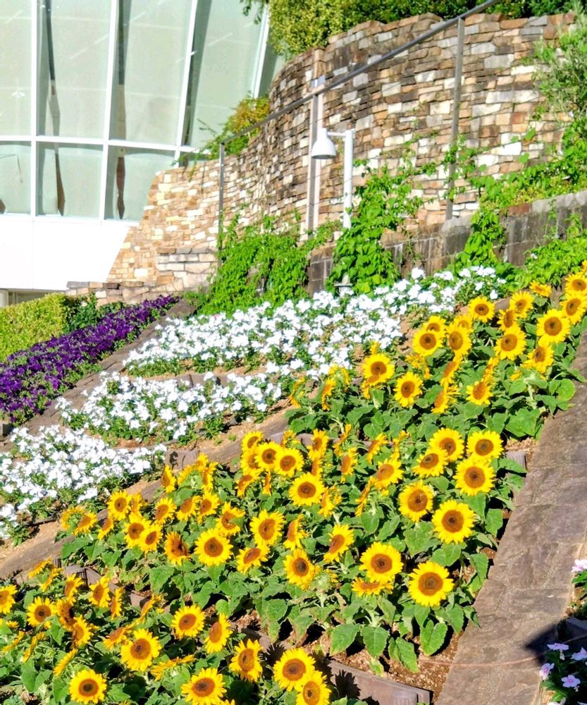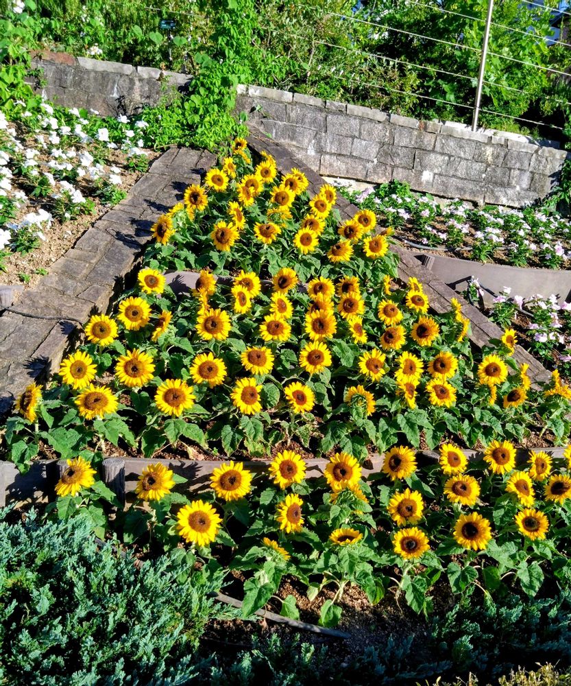 ①②斜面を利用した大型花壇。△▽△▽△と三角に区切られており、今期の主役はミニ🌻