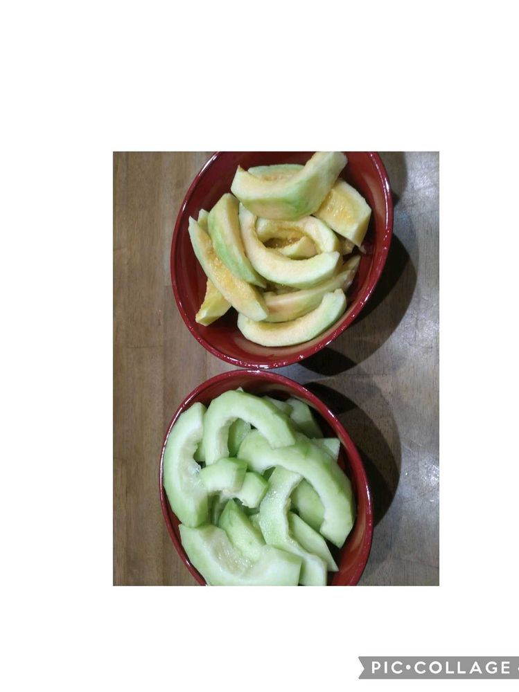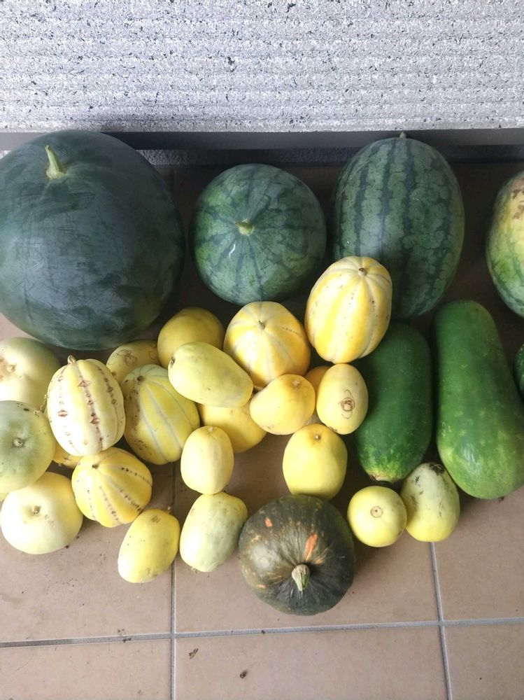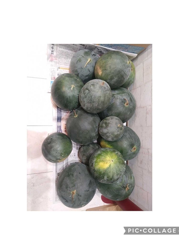 いつもの畑の収穫。キッチンにはスイカの在庫があります。ニューメロン、シマウリの味比べ。