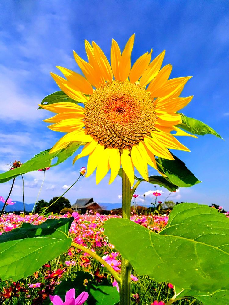 透き通った青空の元、大輪のひまわりが気持ちよさそうに咲いていますね👏