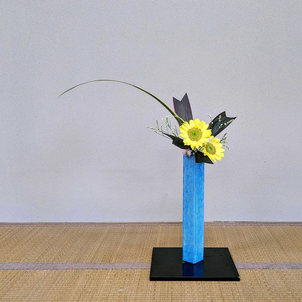 ヒマワリと言えば太陽を思わせるようなお花ですが、お稽古の時に先生が「暑いのでなるべく涼しげに見えるように生けましょうね」と仰いました。