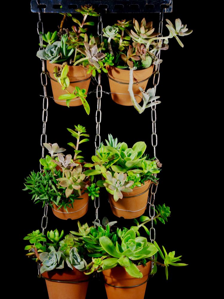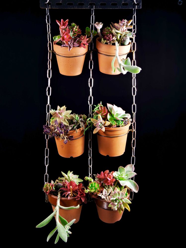 多肉植物 小鉢の吊り下げ 仕立て①は、現在 ②は、25年2月27日