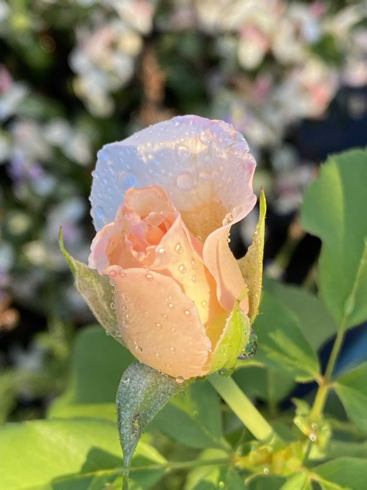 四季咲きのサーモンピンクの名もなき薔薇🌹なんです〜🎶この暑いのに、たくさんの蕾🤭水💦を含んで透けたように見えますね〜可愛い🩷💕です〜