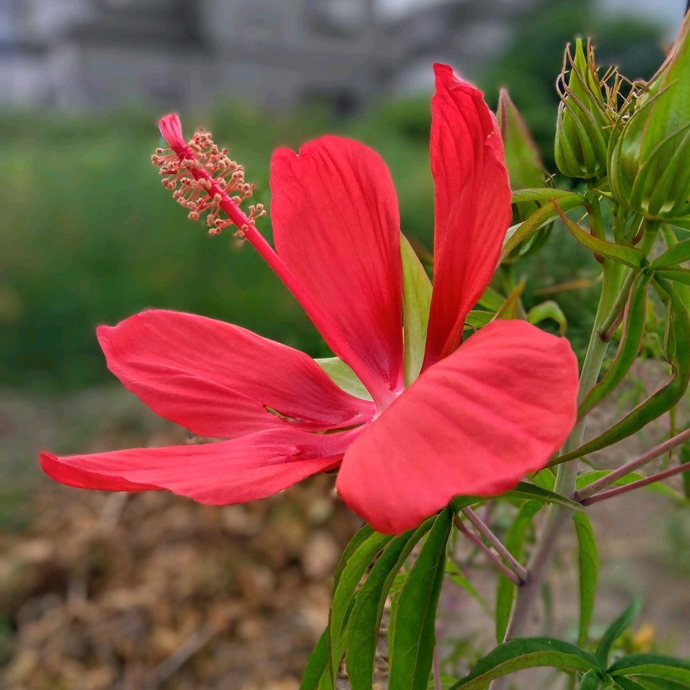 お隣の畑で次々咲く真っ赤なモミジアオイ🌺