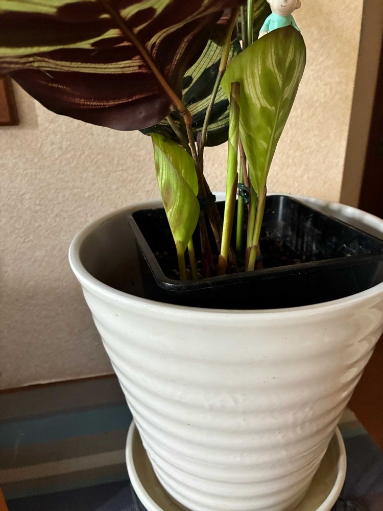 カラテア・マカヤナを二つに株分けした一つの方に新芽が出て、葉っぱがハッキリして来ました。