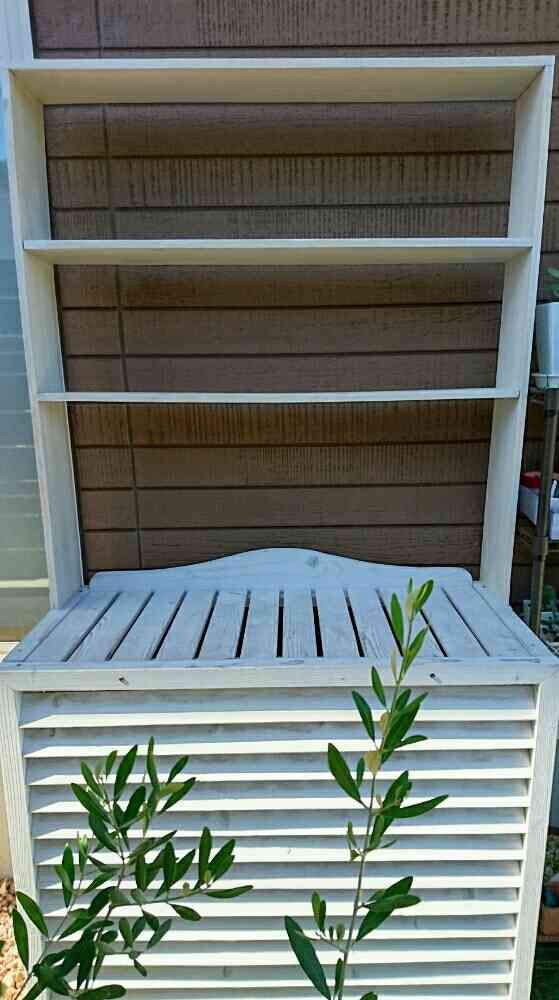 ココは庭の入口付近なので、圧迫感がないように奥行15cmの棚を設計して板を自分で必要な分はカットし、組立て白くペンキで塗って、下の室外機に固定するために名前は分からない金具でとめました☺︎︎