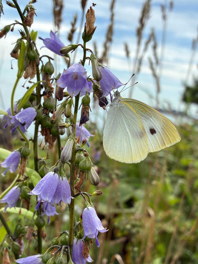 朝日に透けるツリガネニンジンと、透けてないけど蝶々と一緒。