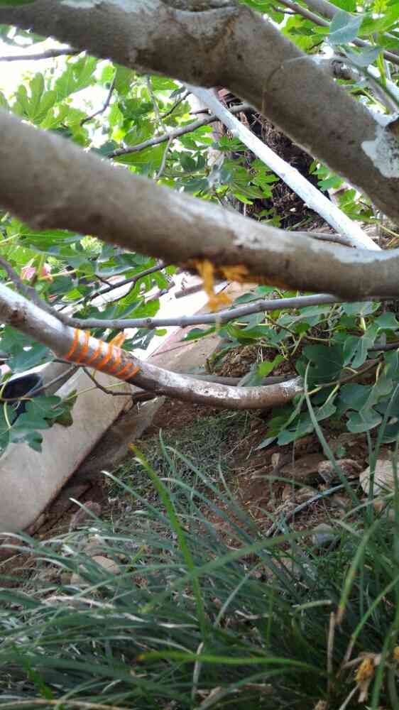 イチジクがカミキリムシにやられたー!手前の枝からふんなど出てる。その向こうは簡単にテープで密封。これでどうだ!