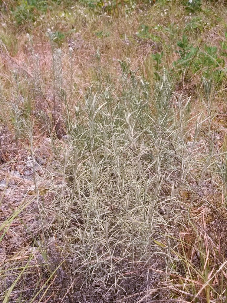 草丈30~50cm、葉は互生し、幅は1~2㎜、葉の長さ2.5~5cm(今生えてるものの実寸)の線形、全体に毛が生え白っぽく見える