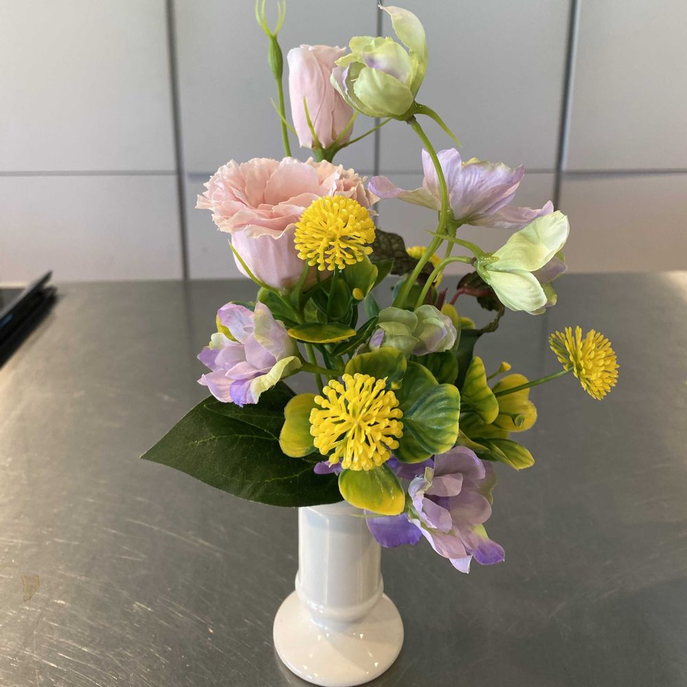 造花のアレンジは初挑戦でしたが、楽しく出来上がりました。