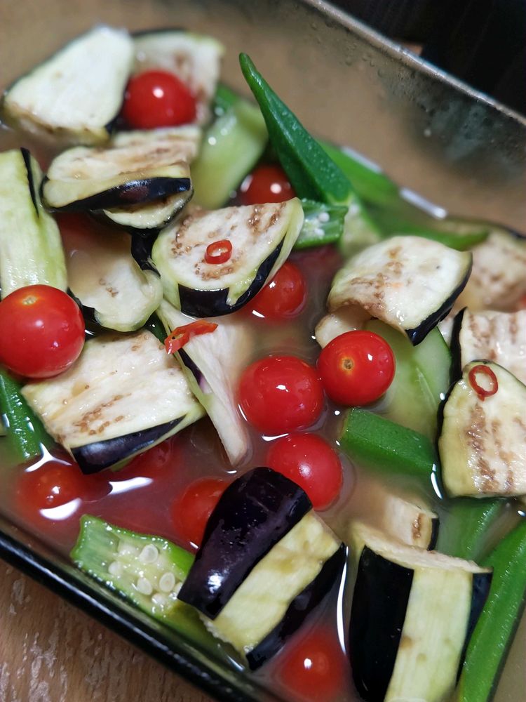 2枚めは、常備菜🏷️の夏野菜🍆🥒🍅のビール(ノンアル)🍺漬け。ワサビや鷹の爪入れてピリ辛、サッパリ。夏を乗り切ろう。