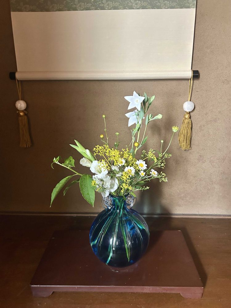深い海のような色合いの花器でキキヨウを中心に小さなお花達🌼