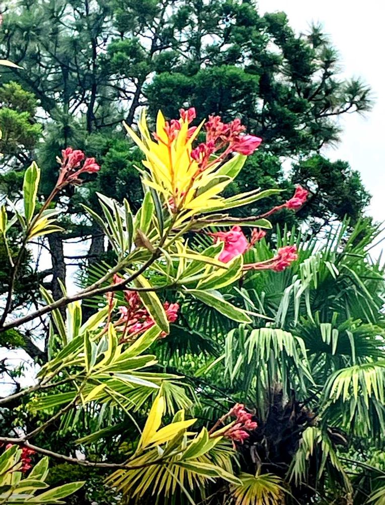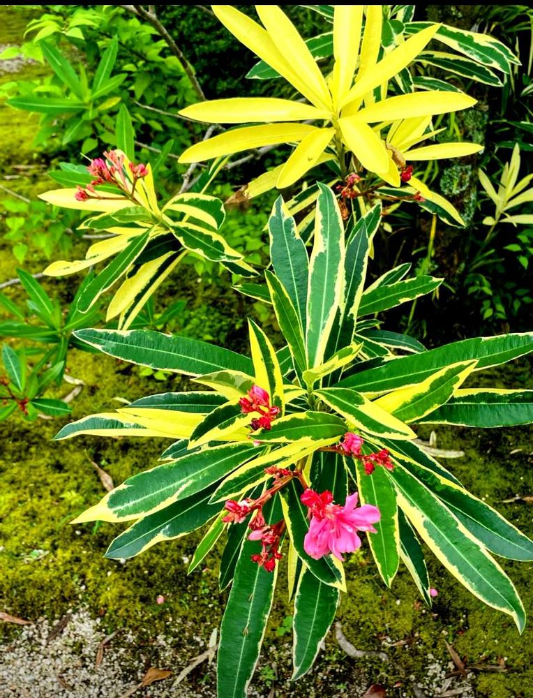 涼を求めて参道の紅葉🍁トンネルをくぐり抜けて、本堂前のお庭を歩いて、班入り夾竹桃を見つけて写真🤳撮った時の物です。
