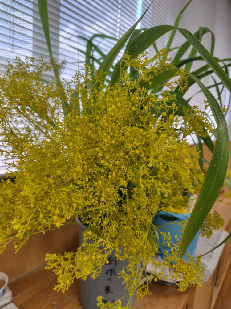 リフレ(老人福祉センター)の仲間がご自宅庭の花を持ってきてくれました。大きな少し斑入りのカヤ オミナエシ 見かけてもよその土地のもので持ち帰れない植物。