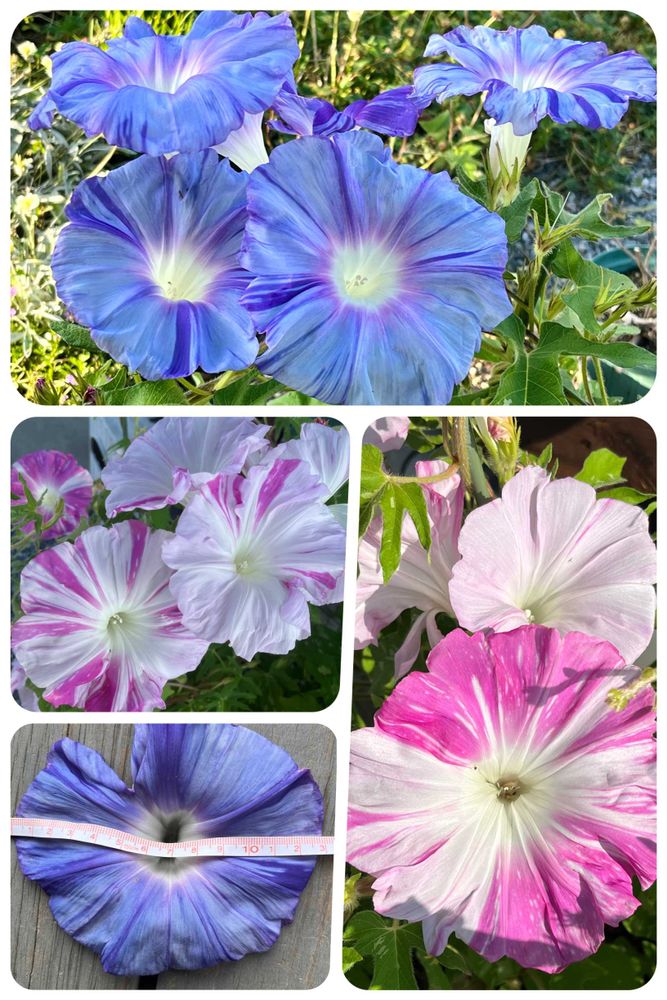 品種もあるのかな?青い方は13cm止まりです。ツルとか厳選して間引くのでしょうか?そしたら大きく咲くのかな?そういうのは私無理ですが😂