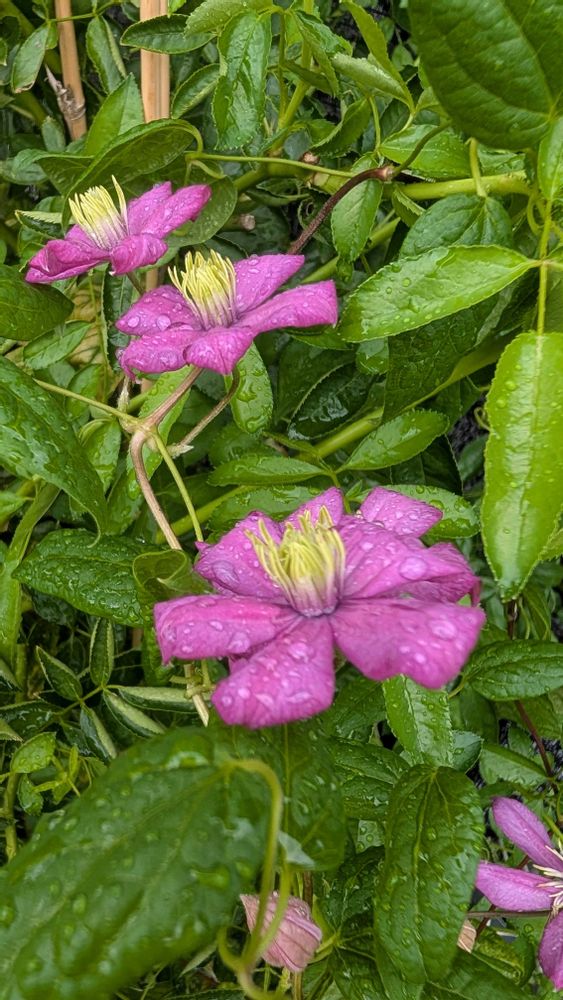 クレマチス ビルドリヨンが咲きました。遅咲き品種らしいです。花後の剪定はどこでカットしたらいいのだろう?