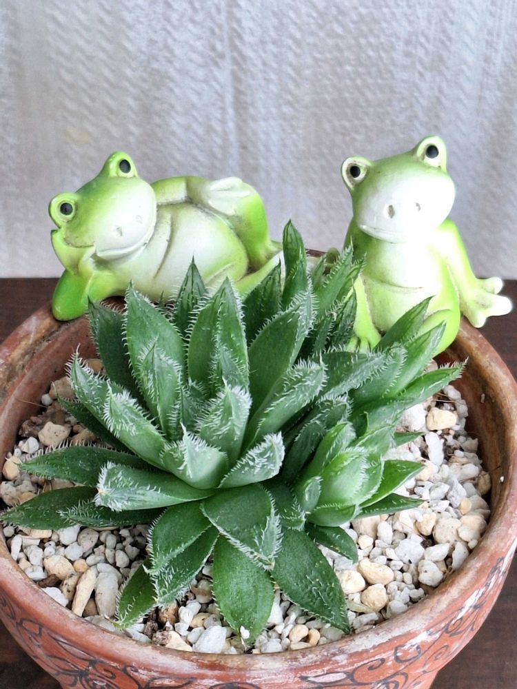 カエルさんたちも、ハオルチア白うさぎさんの近くで、まったりのんびりくつろいでいます🎵😊