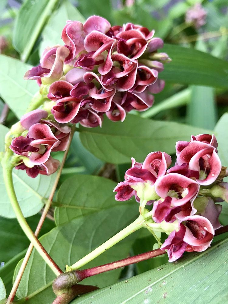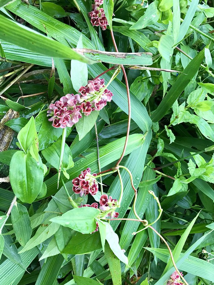 琥珀さんの投稿を見て似た花だなと思い、アメリカホドイモという名前だとは初耳、当時購入したホムセンの園芸売場では別名アピオスだったから。