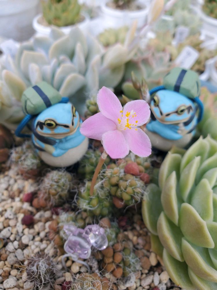 茶傘の鉢、多肉棚の高い所に置いていて久しぶりに下ろしたらお花が咲いていてホッコリ♥️