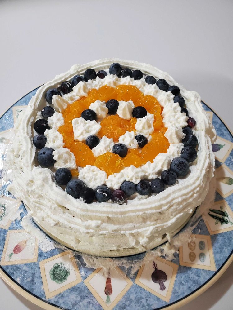 スポンジケーキは私が焼いて、クリームは娘、フルーツはkちゃんが飾りました🎵