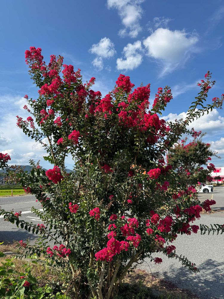 5枚目・よく行くスーパーの🅿️の真っ赤なサルスベリの花です。