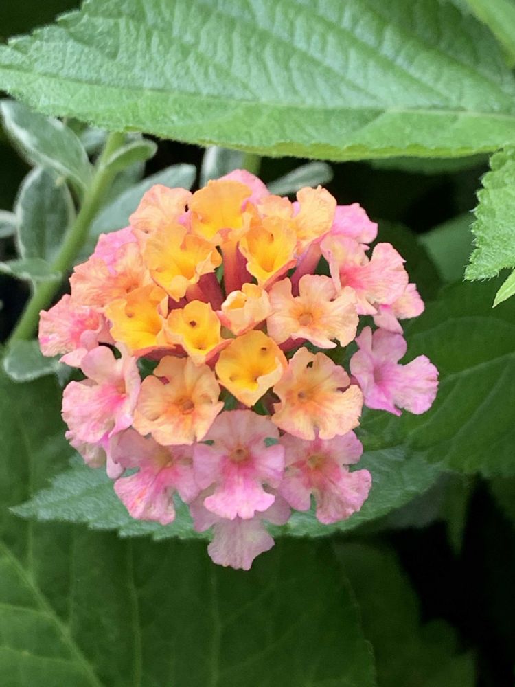 ランタナさんが暑い中、咲いてくれてます💛🩷放ったらかしで毎年咲く優等生さん🌱2枚目はツユクサ科の涼しげな葉っぱ、暑いので伸びた芽を象さんに挿して部屋に持ってきました🌱