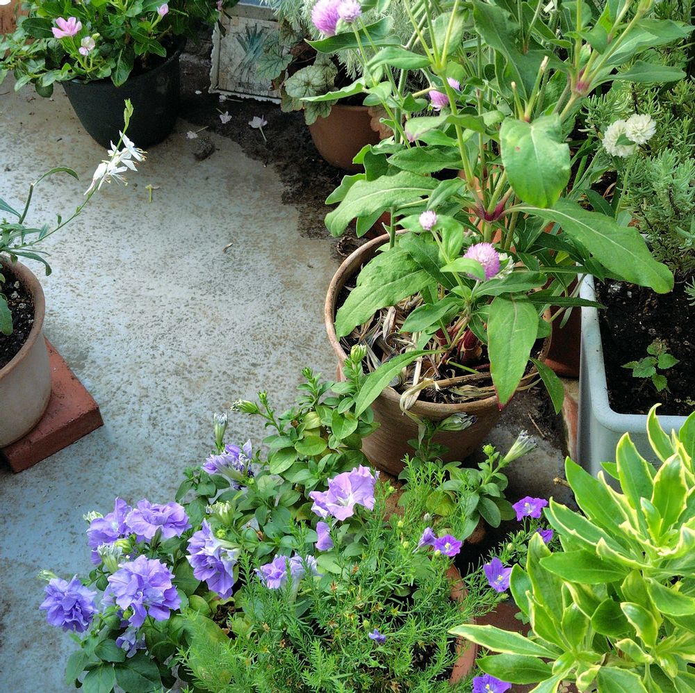 ⑤…2階バルコニーの花たち…手前のニーレンベルギアが とても可愛らしくたくさん咲いていますが、一昨日からの酷暑で葉焼けを起こしています💧(8/3撮影)